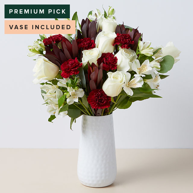 Holiday spirit, in floral form. A sleek vase holds a peppermint swirl of white and burgundy roses, alstroemeria and carnations, with fresh eucalyptus.