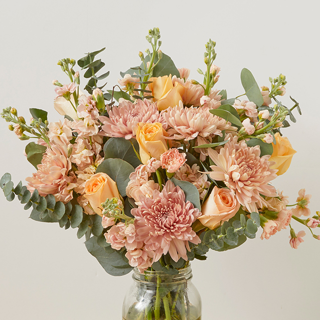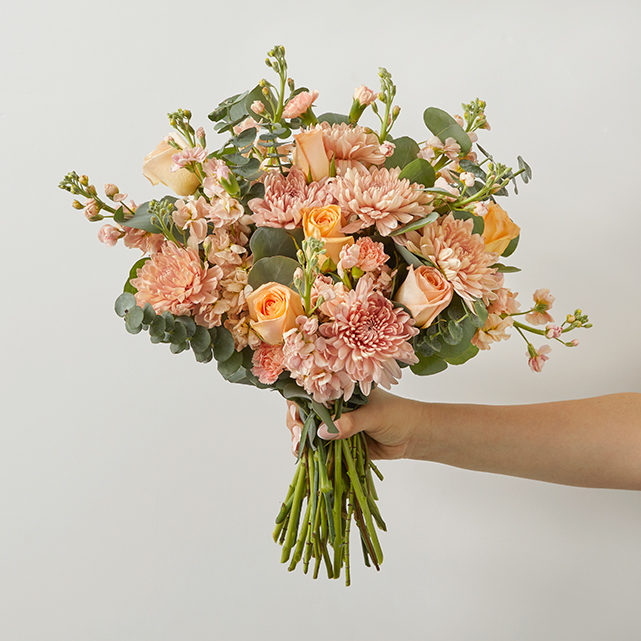 A sugary-sweet bunch of peach carnations, mums and roses perfect for a springtime celebration.