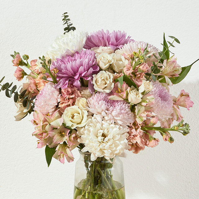 A delicate and dreamy blend of white and pink fairytale mums, white spray roses, alstroemeria, and eucalyptus. It radiates timeless beauty and charm.