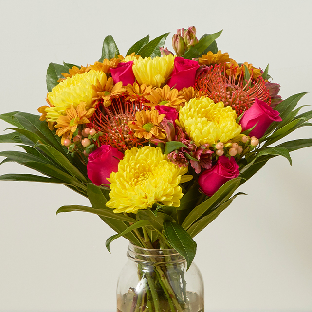 tropical-inspired bunch of bright yellow mums, orange pincushion and pompons, and pink roses.
