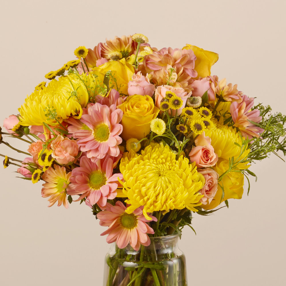 Taking inspiration from the colors of the Caribbean, this bouquet offers a gradient-like effect — thanks to saturated shades of yellow and peach in the form of pom daisies, roses and mums.