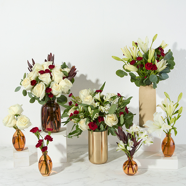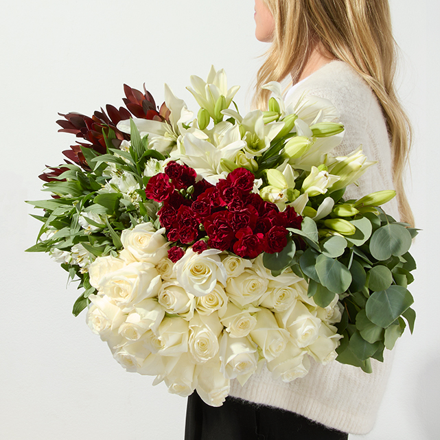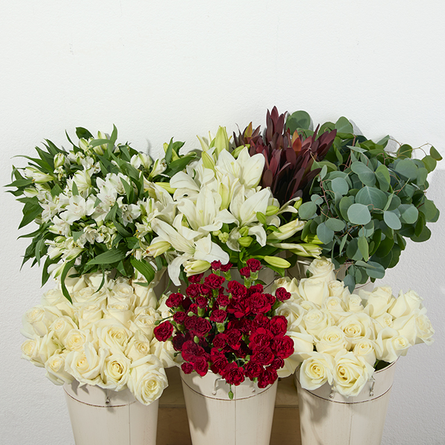 Ingredients: 100+ stems of burgundy mini carnations, white lilies, alstroemeria, white roses, safari sunset, and eucalyptus