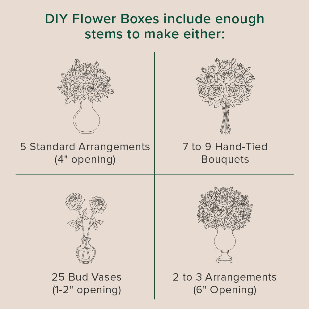 DIY Flower Boxes include over 100 stems for your flower arranging enjoyment, so you can gather them for one statement piece or arrange in smaller (but equally gorgeous) bouquets or installations. If styling in a standard vase with a 4” opening, expect anywhere from six to nine arrangements.