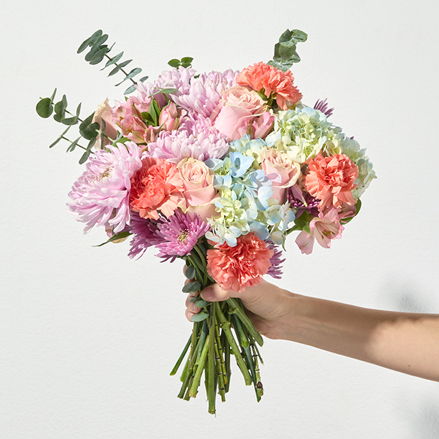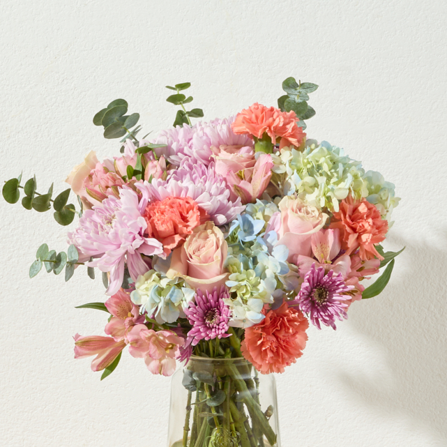 This vibrant symphony of color and texture blends together blue hydrangeas, peach roses, pink mums and poms, orange carnations, pink alstroemeria, and eucalyptus leaves.