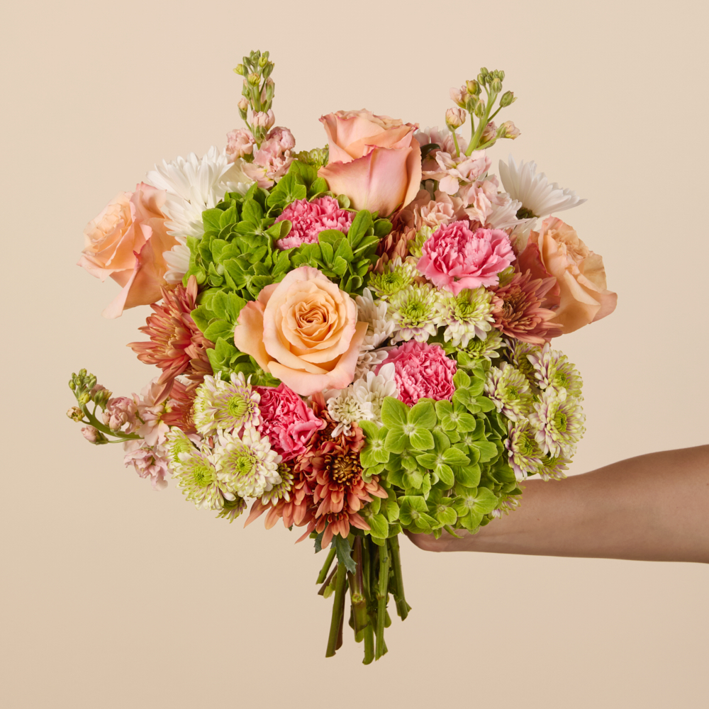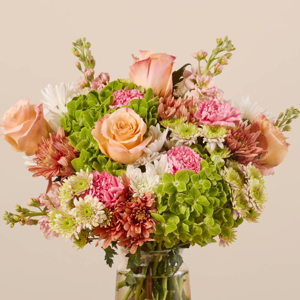Lush, green hydrangea paired with pretty peach roses come together to create a modern, design forward arrangement. Cushion-white pompons and pink carnations top off this unforgettable bouquet.