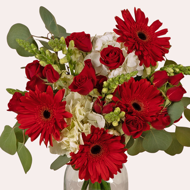 Gotta love Love Me Do! Meet this arrangement’s fab-ulous four: white hydrangea & snapdragons plus red gerbera daisies & spray roses.