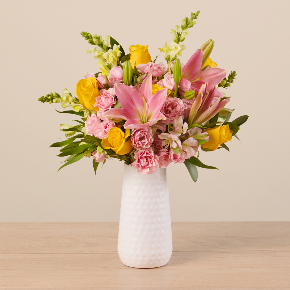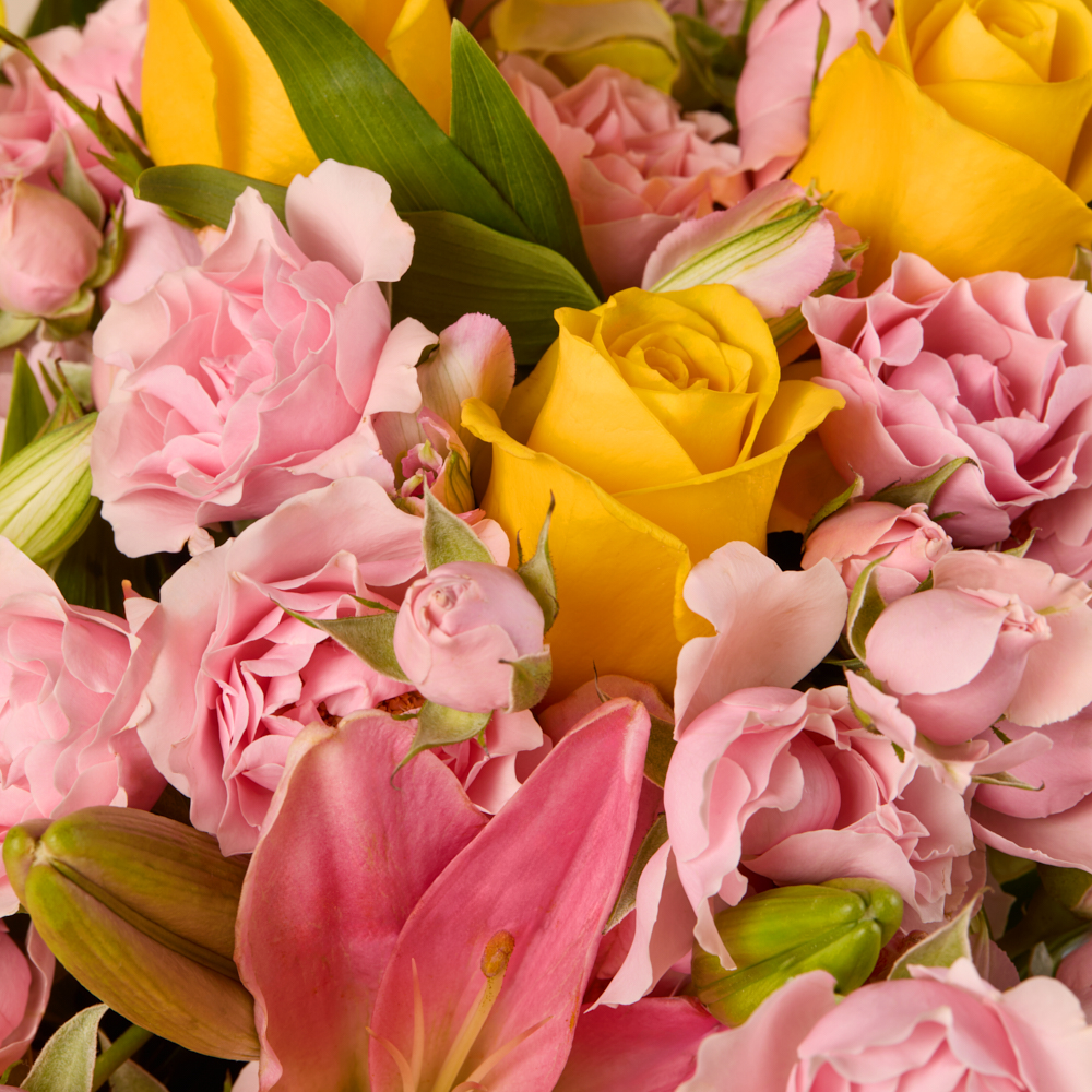 A stunning mixed arrangement of pink and yellow roses, lilies, and alstroemeria.