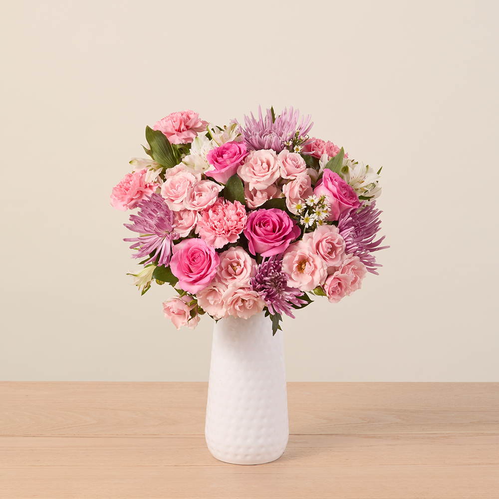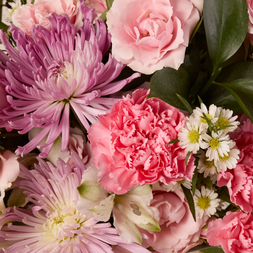 Mixed Pink arrangment with roses, carnations and mums.