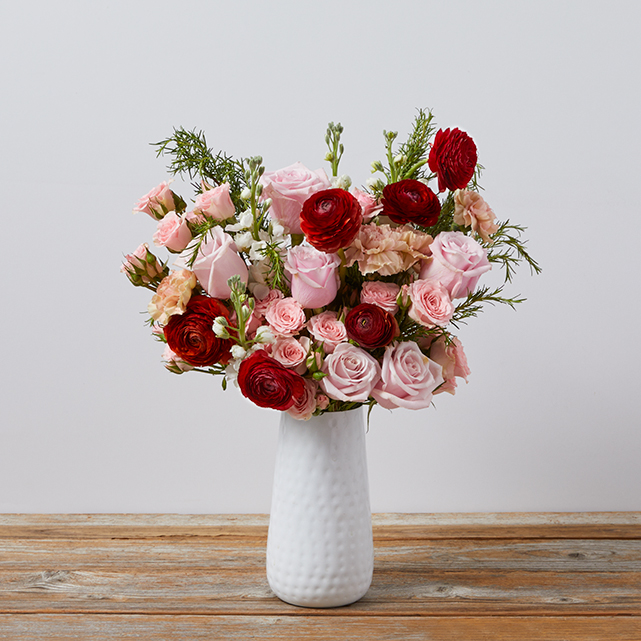 Bouquet featuring red ranunculus with blush roses and pink spray roses.