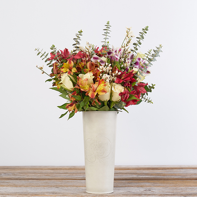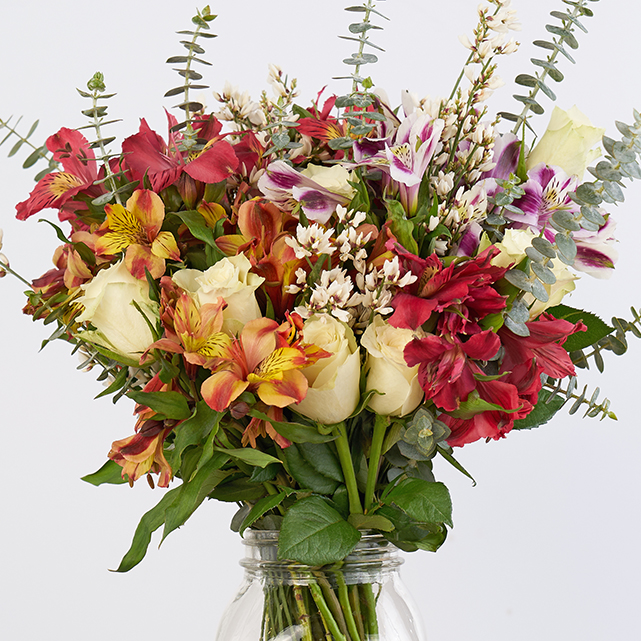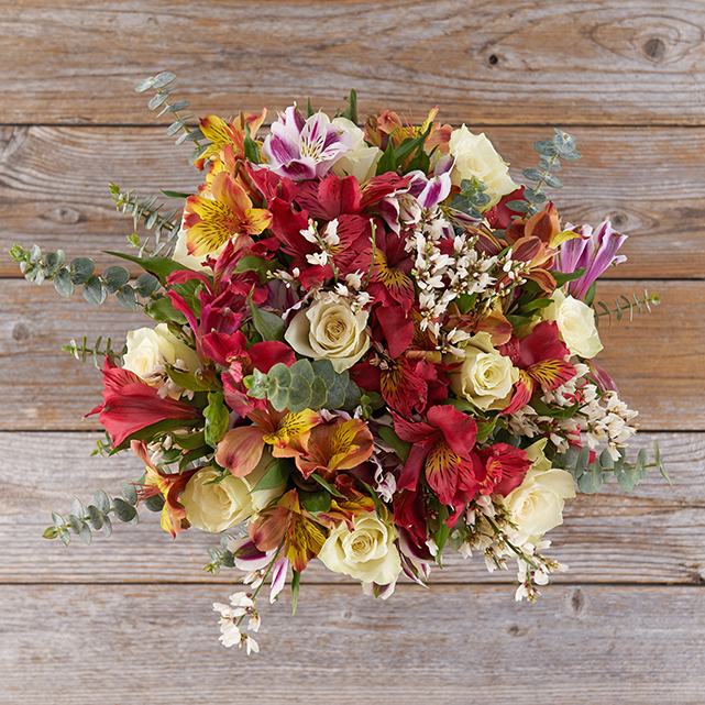 Send your best wishes to your fave Rose with this tasteful Bouq, full of white roses, orange and yellow Peruvian lilies, and eucalyptus.