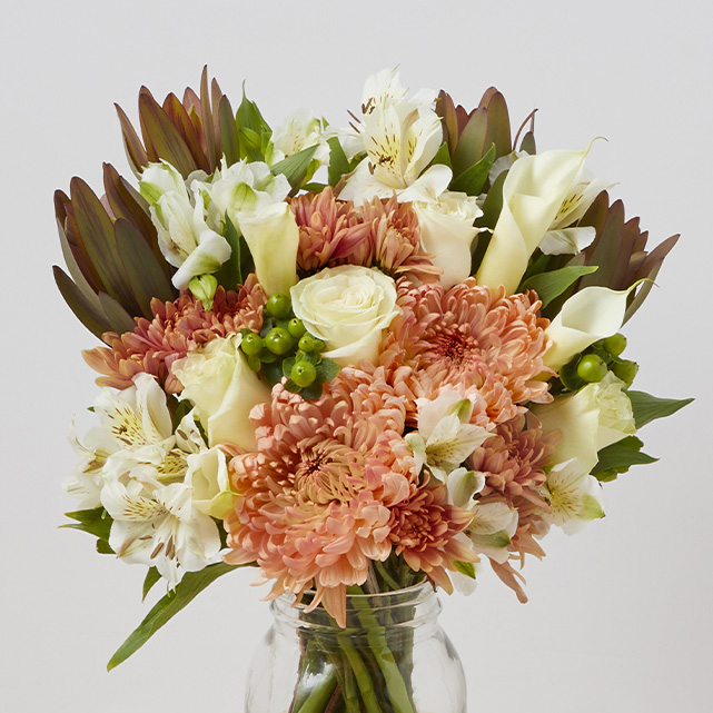 This classy arrangement of calla lilies, white roses, and fluffy peach mums and pompoms pairs nicely with a horse race and a big hat. Sip slowly and place your bets!