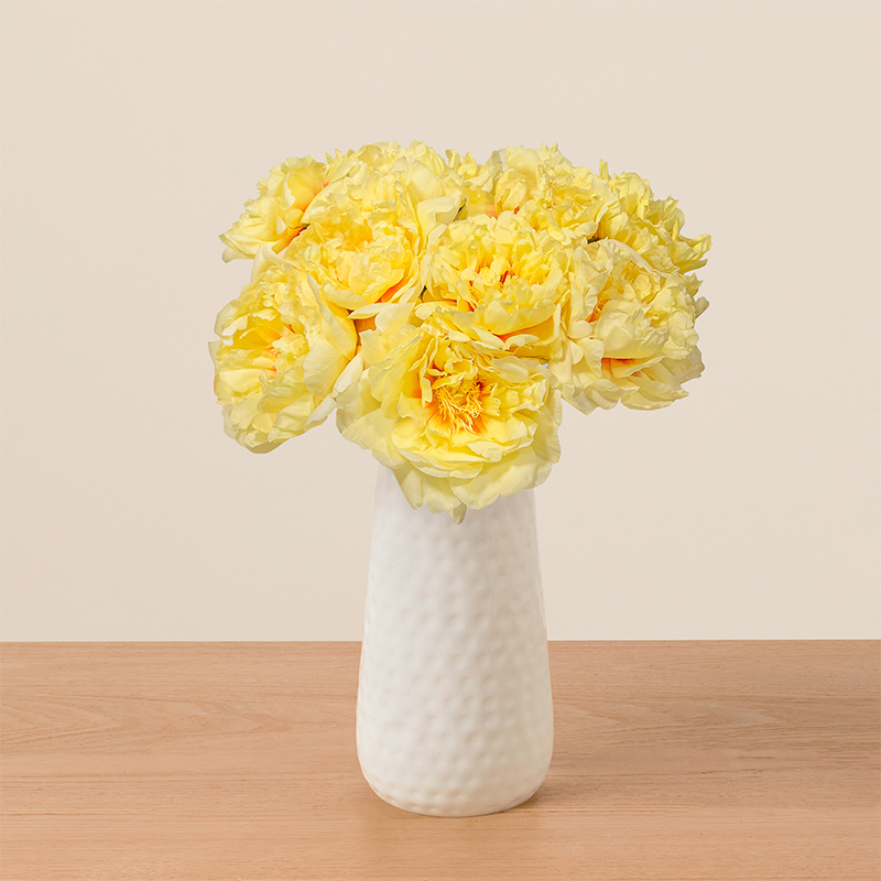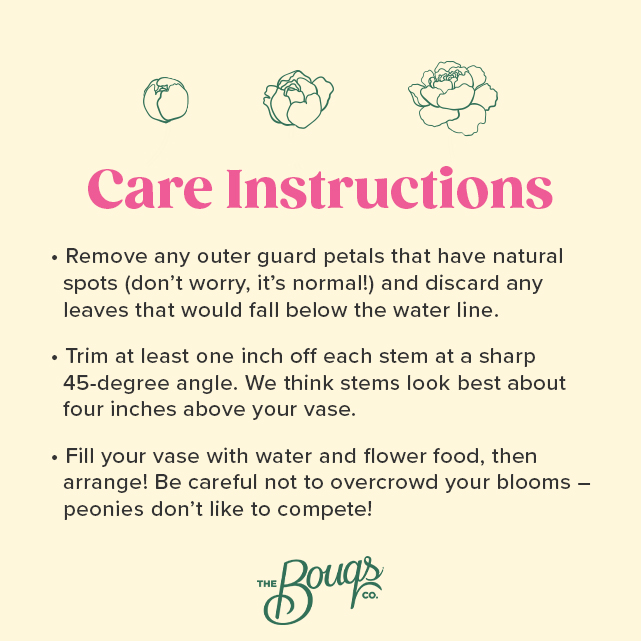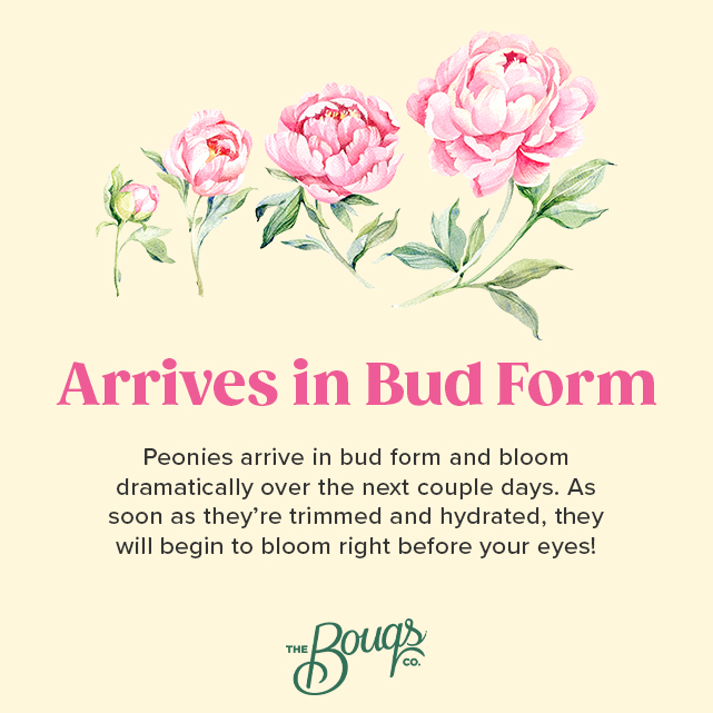 Peonies arrive in bud form and bloom dramatically over the next couple days. As soon as they’re trimmed and hydrated, they will begin to bloom right before your eyes!