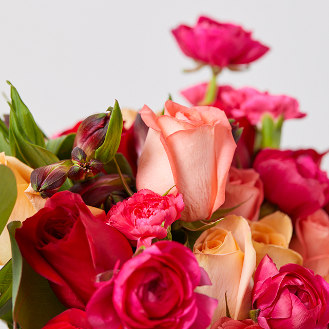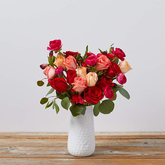 This blazing Bouq is guaranteed to heat things up. Make a bold statement with roses and ranunculus in peachy pinks and fiery reds.