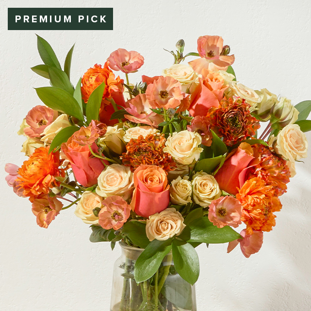 Just for you, darling. This juicy arrangement boasts whimsical butterfly ranunculus, lively orange pon pon ranunculus, radiant orange roses, and soft, cream spray roses.