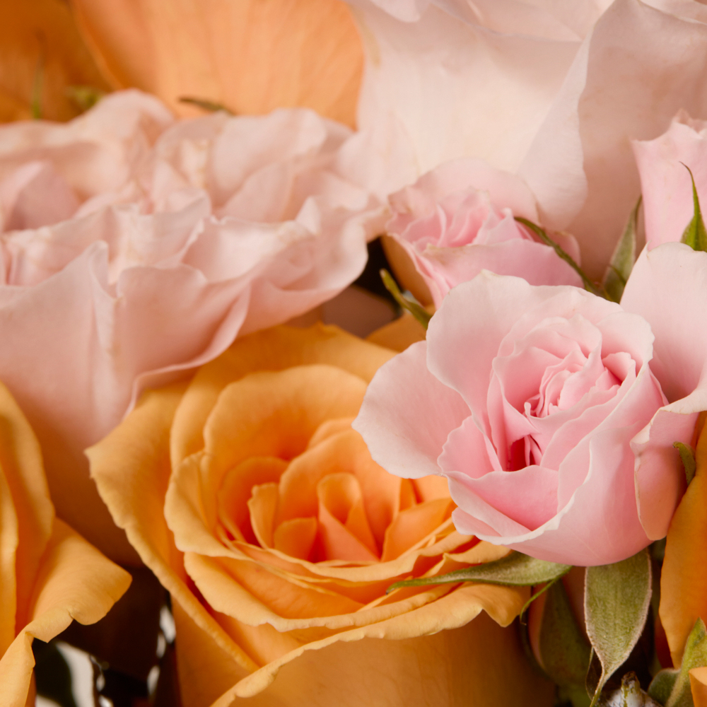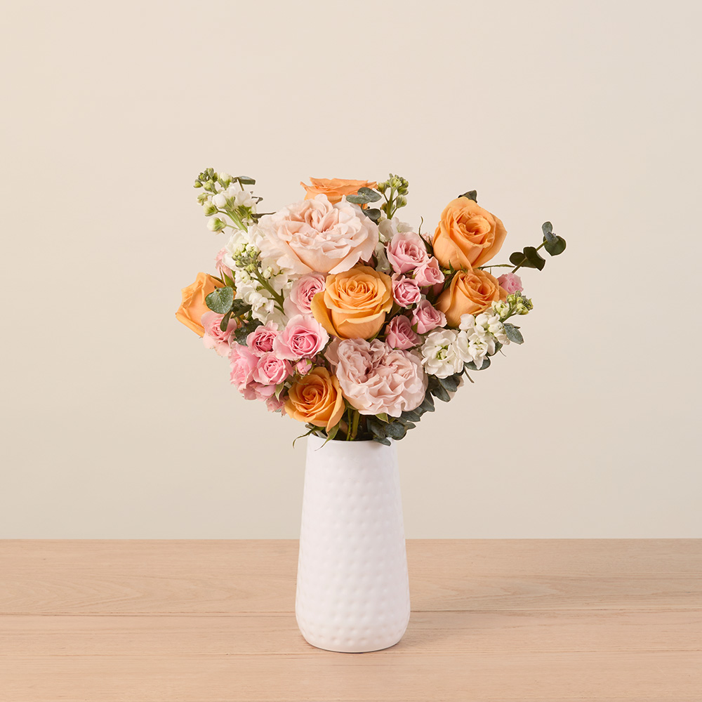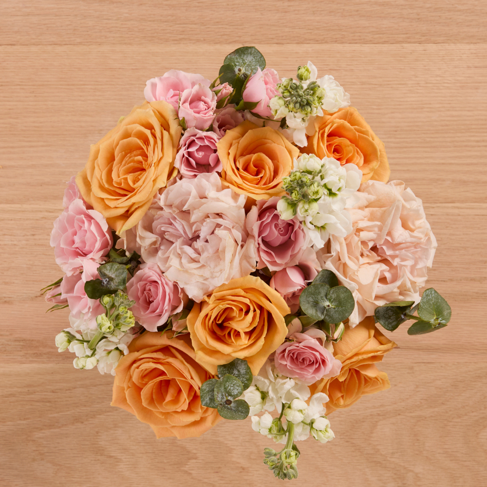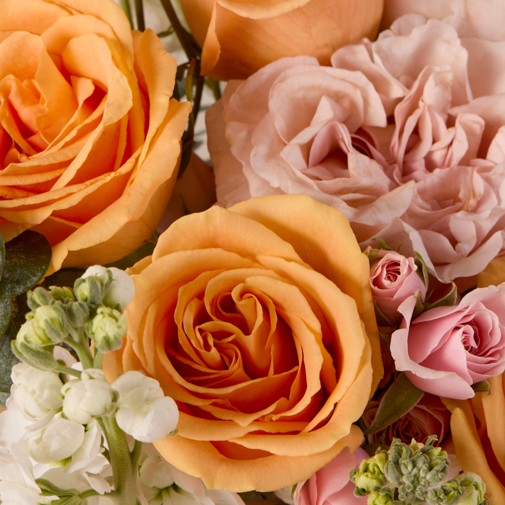 An oh-so-sweet bouquet featuring peach and pink roses.