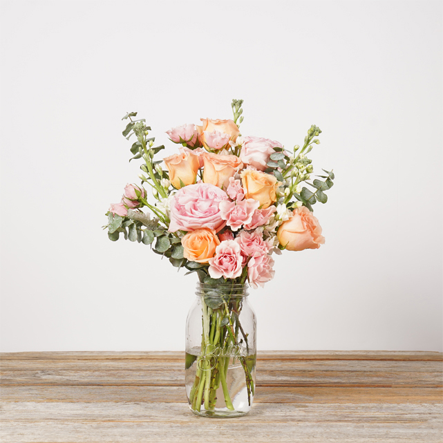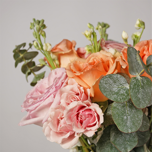 Ingredients: Peach and pink garden roses and standard roses with eucalyptus