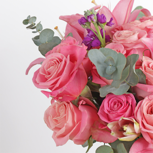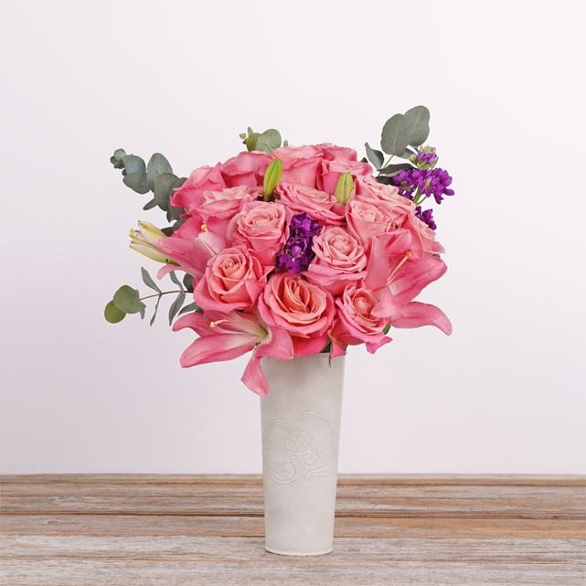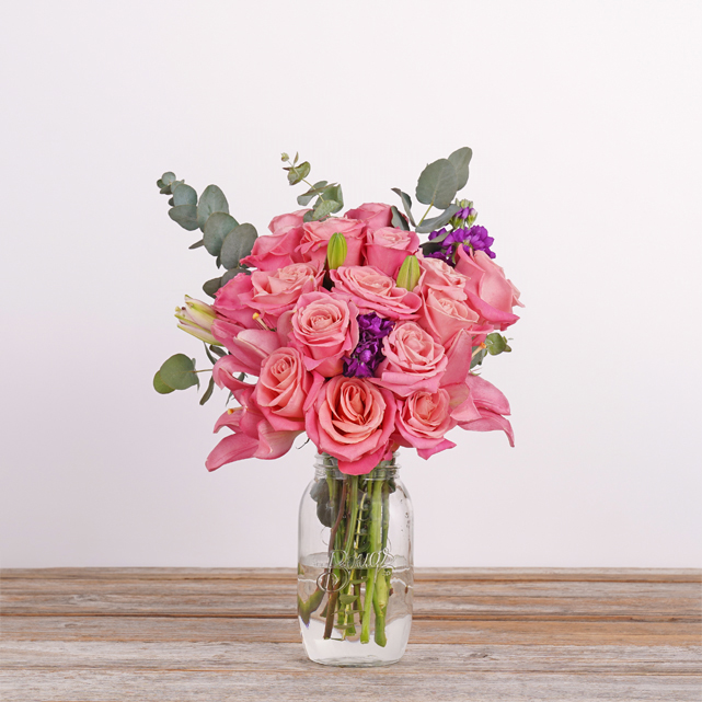 Feast your eyes on this sugar-spun confection. Pink roses, purple stock, eucalyptus, and pink Asiatic lilies are as fluffy and sweet as the perfect batch of cotton candy. These blooms are best paired with hugs and kisses.