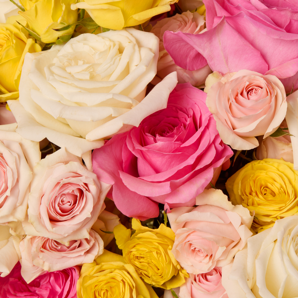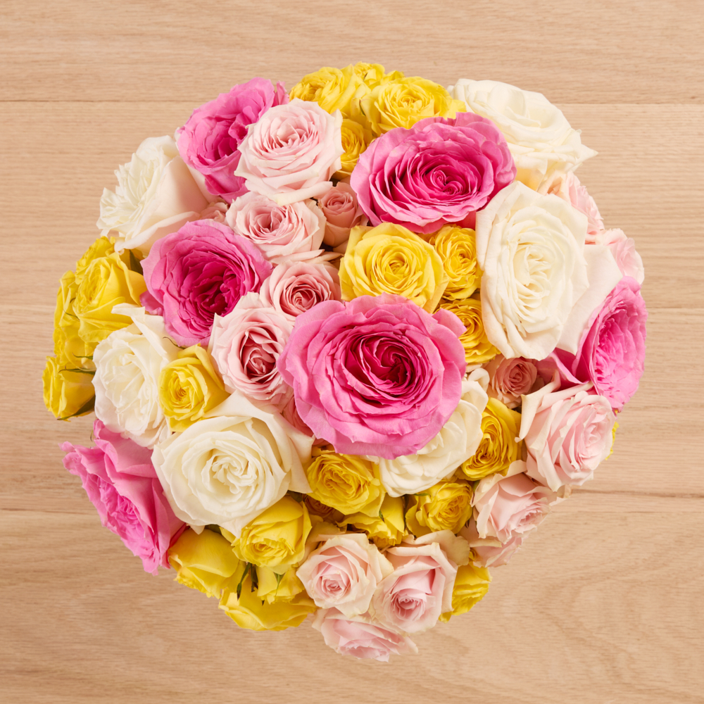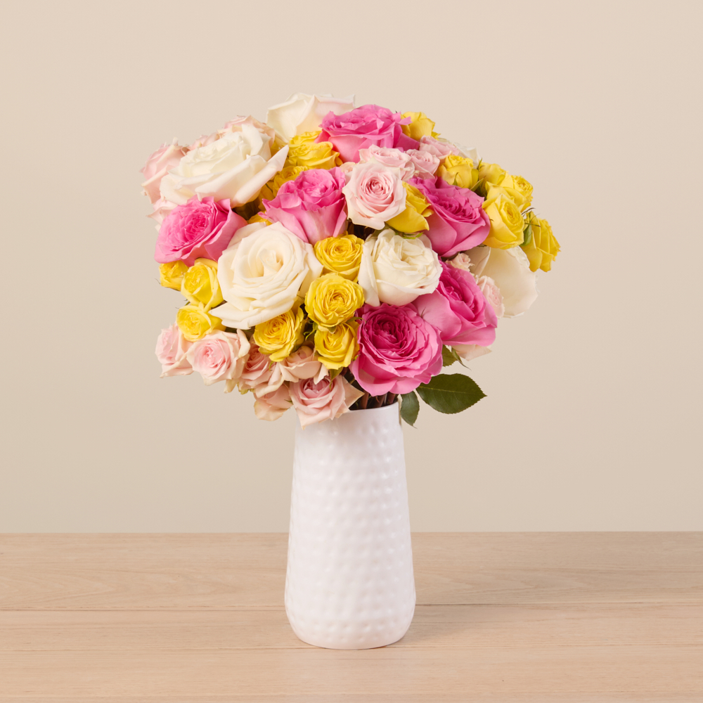 Make mom’s day with this stunning bouquet, featuring white and pink roses plus yellow and blush spray roses.