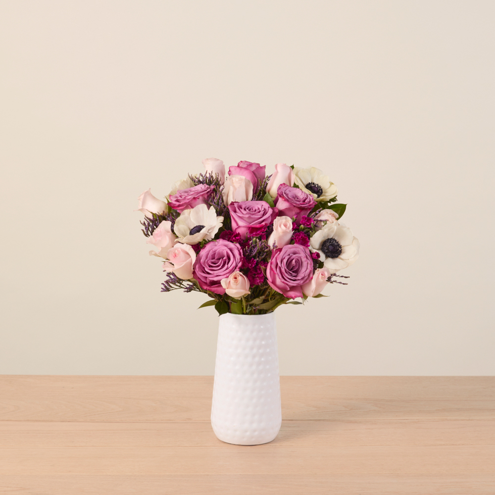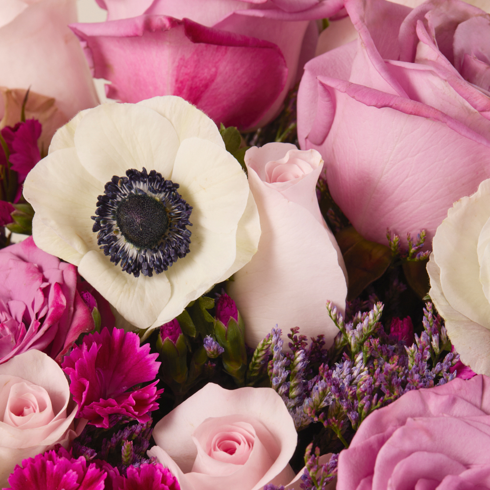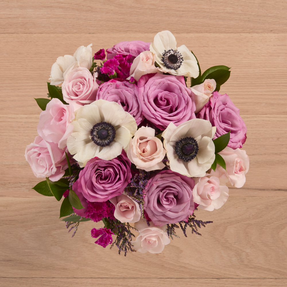 It’s easy to fall in love with pretty light pink roses, purple roses, white anemones, and solomio. These blooms are a fairy tale come true.