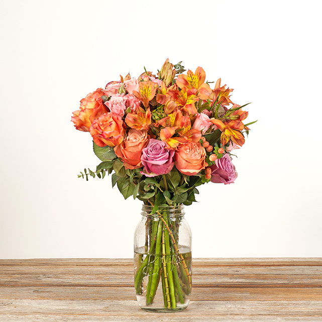 Ingredients: Peach, lavender, and coral roses with peach and pink accents.