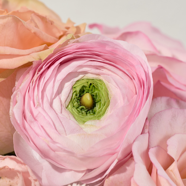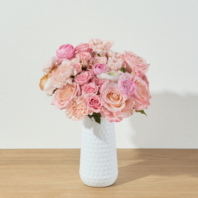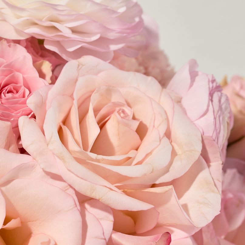 Ingredients: An all-pink bouquet of roses, ranunculus, carnations, and solomio