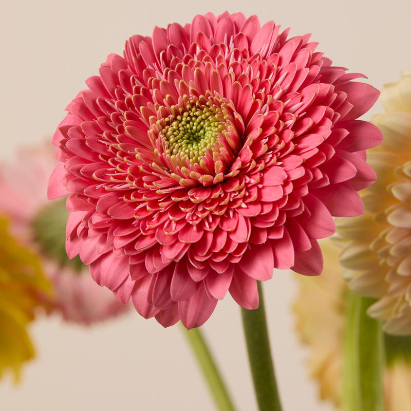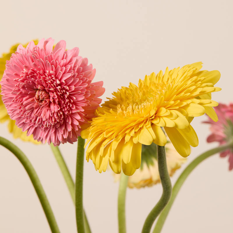 A glow-up on the classic daisy. These frilly blooms come in peach, pink, and sunny yellow, with lush layers of petals that look almost too perfect to be real.