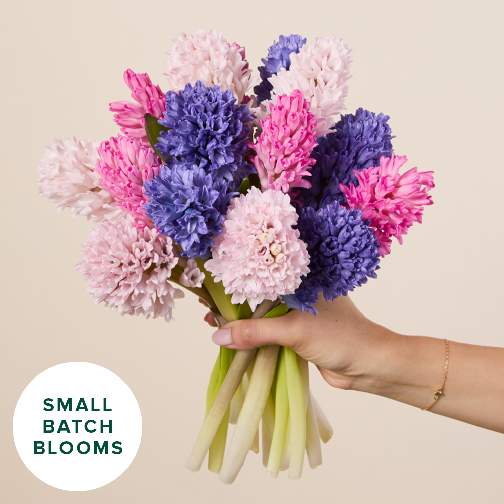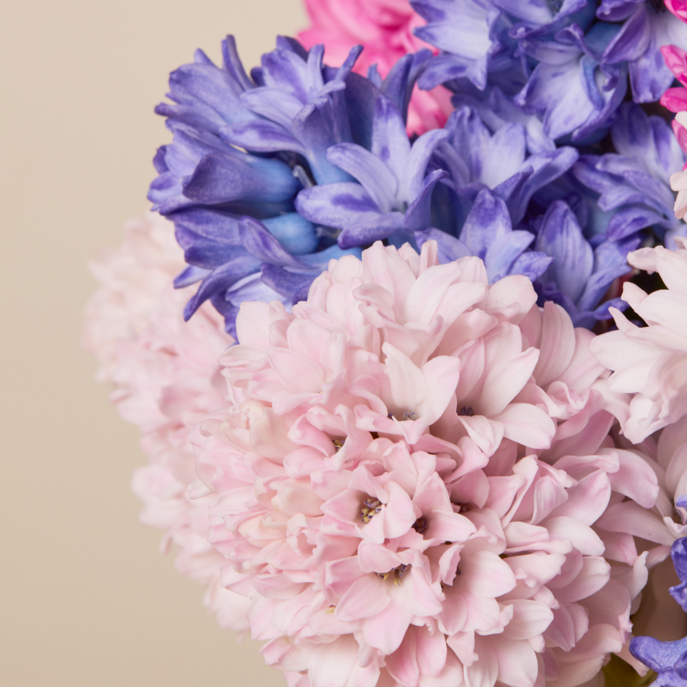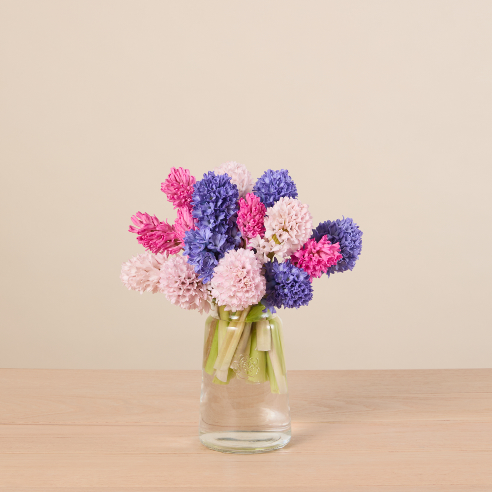 Soft, sculptural blooms with tightly clustered petals, this Bouq features hyacinths in shades of pink and purple.