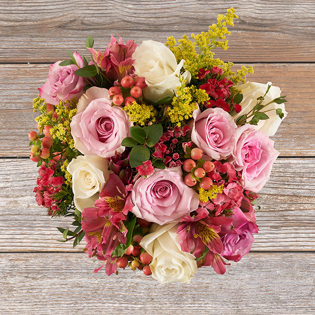 Share pink roses, parvifolia, and hypericum berries with the one who makes your heart flutter. These blooms bring Cloud 9’s within reach.
