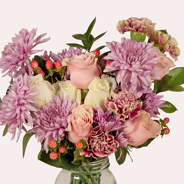Like a perfect random chance, lavender mums, pink poms & roses, and white roses together are a soul-affirming Meet Cute. Attractive date not included.