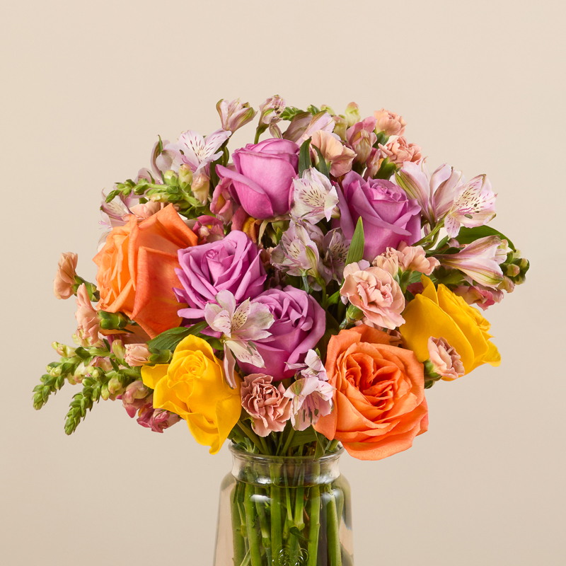 A gentle Afternoon Breeze in farm-fresh flower form. This delightful arrangement has lavender, yellow, and peach roses mixed with whimsical accent blooms and a hint of magic.