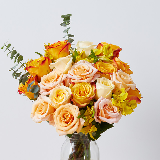 Give any room a glow up with this Bouq. Cream, peach and bi-color orange roses play starring roles alongside golden alstroemeria and eucalyptus.