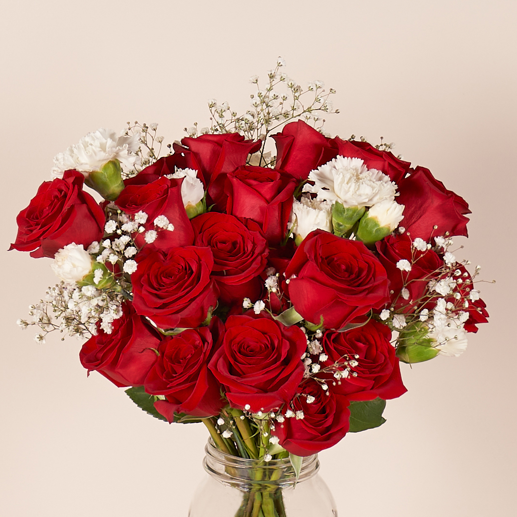 These red roses, white carnations, and baby’s breath raise the barre for holiday blooms. With petals as fluffy as tutus, dancing may occur.