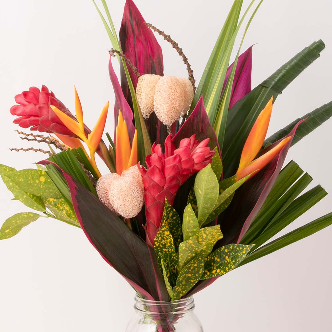 Lady Lei brings the island straight to you with her mix of tropical flowers, pink loofahs, red ginger, and greenery. No trip required.