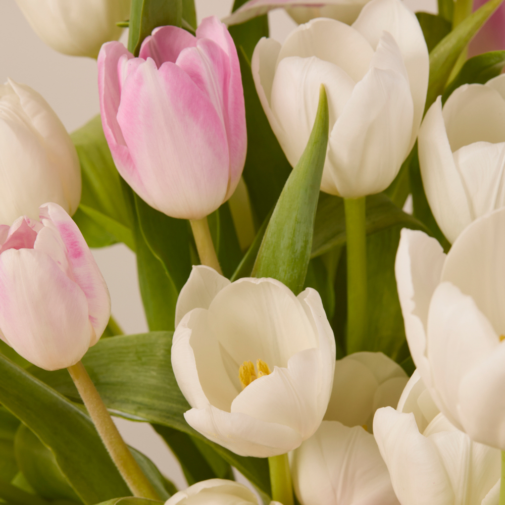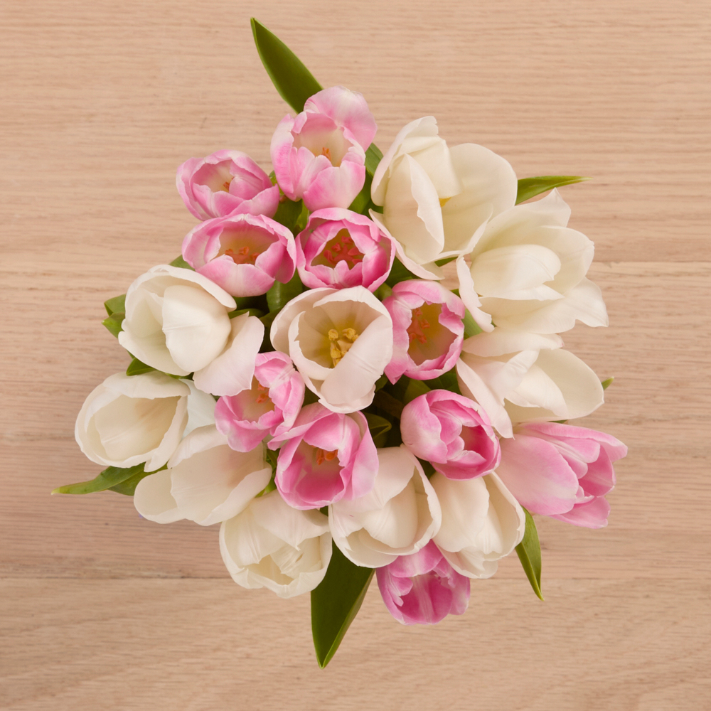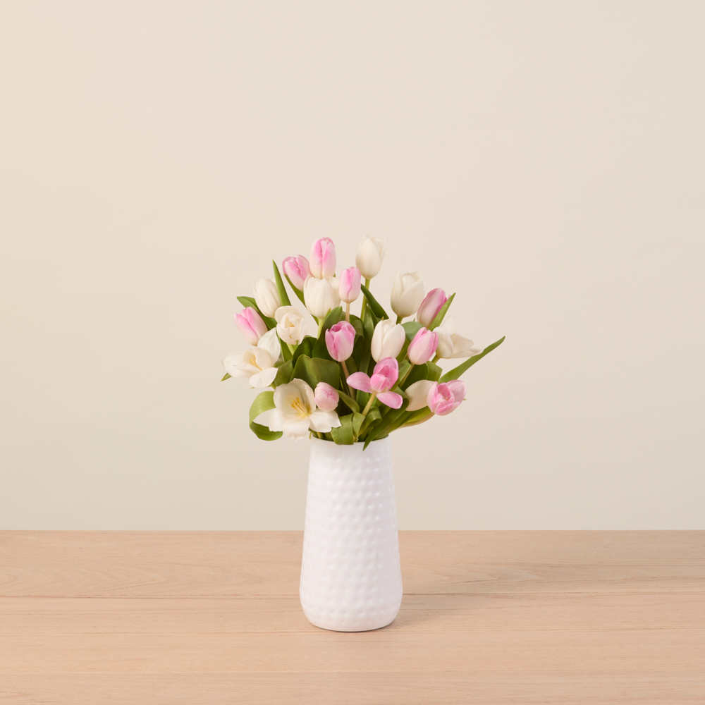 Tulips are soft-stemmed beauties that arrive in bulbs. As soon as they're trimmed and hydrated, they will begin to bloom! Curved stems, caused by phototropism, is tulips' natural response to light — this is easily solved with a tall vase that supports the stems. Display in an area safely out of your pet's reach.