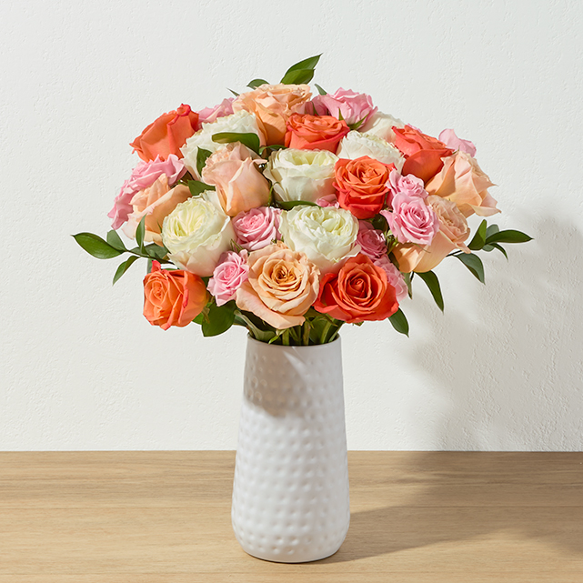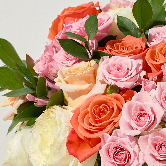 Ingredients: A mixed rose bouquet with campanella, free spirit, and star blush roses.